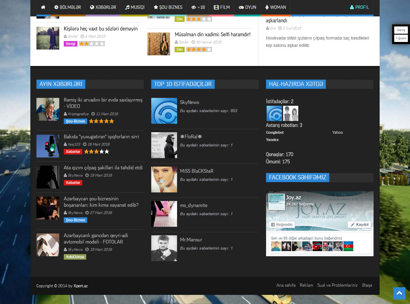 Vebsaytda "Ən bəyənilən", "Ən çox baxılan", "Ən çox rəy yazılan" və Admindən seçmələr adlı xəbərlər paneli vardır. Top 10 müəlliflər panelində isə ay ərzində ən çox xəbər göndərən aktiv istifadəçiləri görmək olar. Həmçinin saytın aşağı hissəsində ay ərzində çox oxunan xəbərləri də görmək mümkündür. Yeni dizaynda loqo da dəyişdirildi.