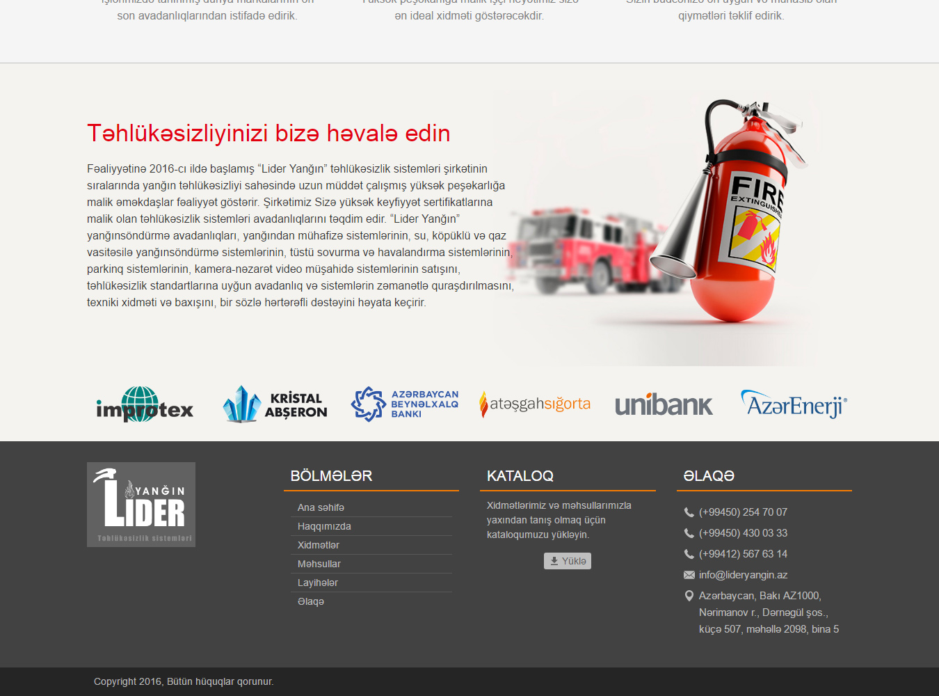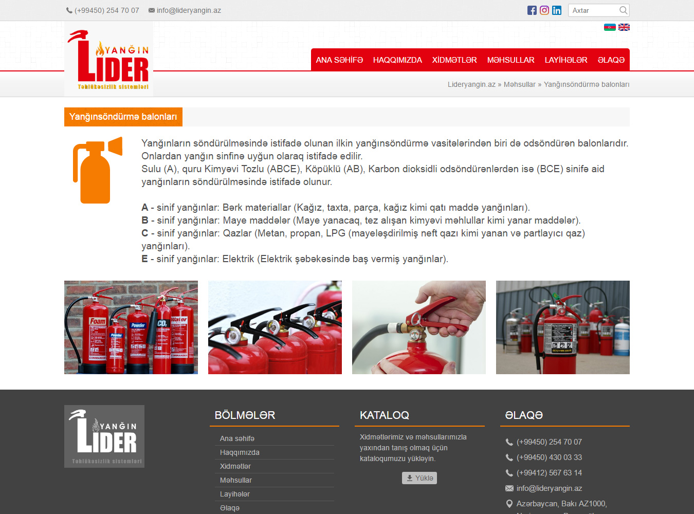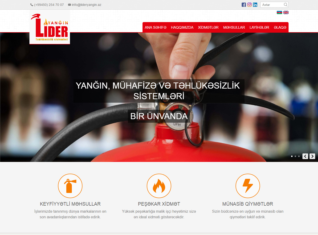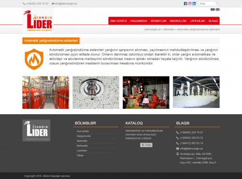 Fəaliyyətinə 2016-cı ildə başlamış “Lider Yanğın” təhlükəsizlik sistemləri bu sahədə uzun müddət çalışmış yüksək peşəkarlığa malik əməkdaşlarla fəaliyyət göstərir. Şirkətimiz Sizə yüksək keyfiyyət sertifikatlarına malik olan təhlükəsizlik sistemləri avadanlıqlarını təqdim edir. “Lider Yanğın” yanğınsöndürmə avadanlıqları, yanğından mühafizə sistemlərinin, su, köpüklü və qaz vasitəsilə yanğınsöndürmə sistemlərinin, tüstü sovurma və havalandırma sistemlərinin, parkinq sistemlərinin, kamera-nəzarət video müşahidə sistemlərinin satışını, təhlükəsizlik standartlarına uyğun avadanlıq və sistemlərin zəmanətlə quraşdırılmasını, texniki xidməti və baxışını, bir sözlə hərtərəfli dəstəyini həyata keçirir.