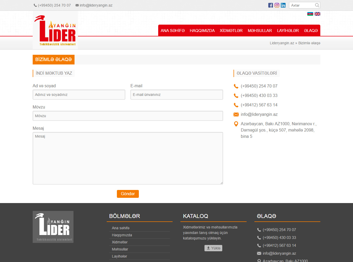 “Lider Yanğın” öz sıralarında müasir iş üslubları ilə çalışan, təhlükəsizlik avadanlıqları sahəsində çoxillik iş təcrübəsinə malik olan, yüksək ixtisaslı texniki mütəxəssisləri birləşdirən, dinamik inkişaf edən təhlükəsizlik sistemləri şirkətidir. Biz, avadanlıq və komponentlərin aparıcı istehsalçıları ilə əməkdaşlıq sayəsində, müştərilərimizə keyfiyyətli məhsul, müxtəlif konfiqurasiyalı komponentlər, zəmanətli çatdırılma, quraşdırılma və çevik qiymət siyasəti təklif edirik.