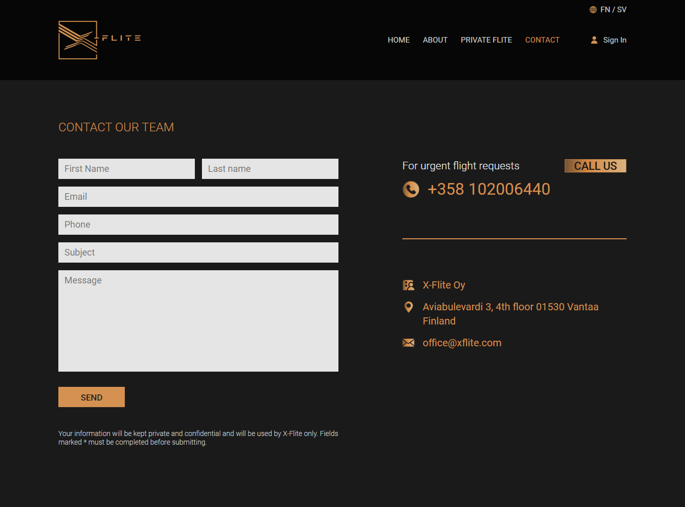 X-FLITE OY Finlandiyada xüsusi aviasiya şirkətidir, hansı ki, problemsiz, sürətli və xüsusi qrafik olmadan istənilən anda uçuş səyahətlərini yerinə yetirir.