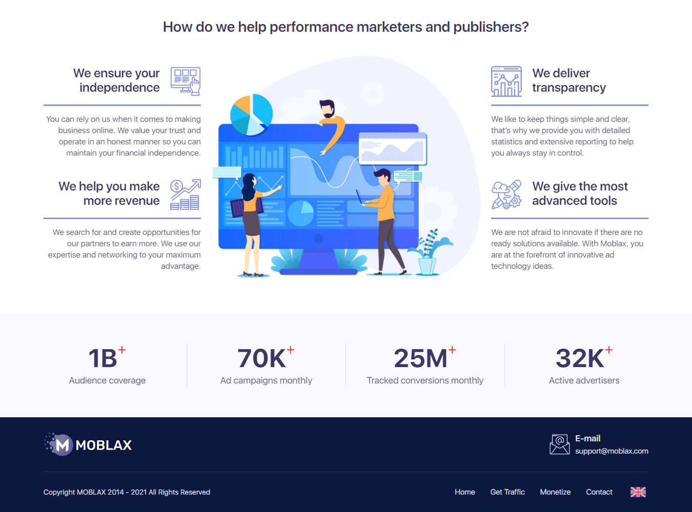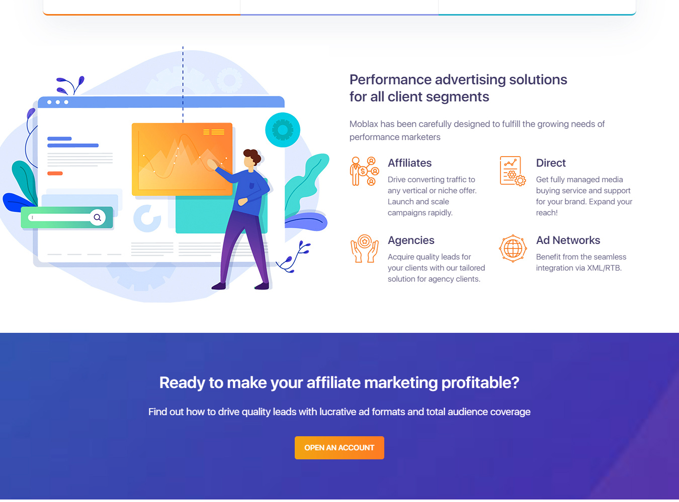 Hər şeyi sadə və aydın saxlamağı sevirik, sizə ətraflı statistika və geniş hesabat təqdim edirik. Hazır həllər yoxdursa, yenilik etməkdən qorxmuruq. Moblax ilə siz innovativ reklam texnologiyası ideyalarının önündəsiniz.